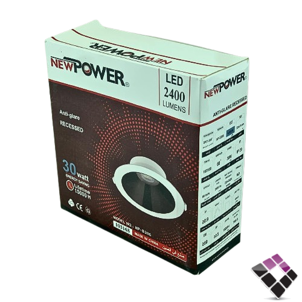 كشاف داخلي LED مع مانع توهج NEW POWER إضاءة 6500K أبيض جرم خارجي أبيض داخلي أسود مقاس 8"×30W رقم