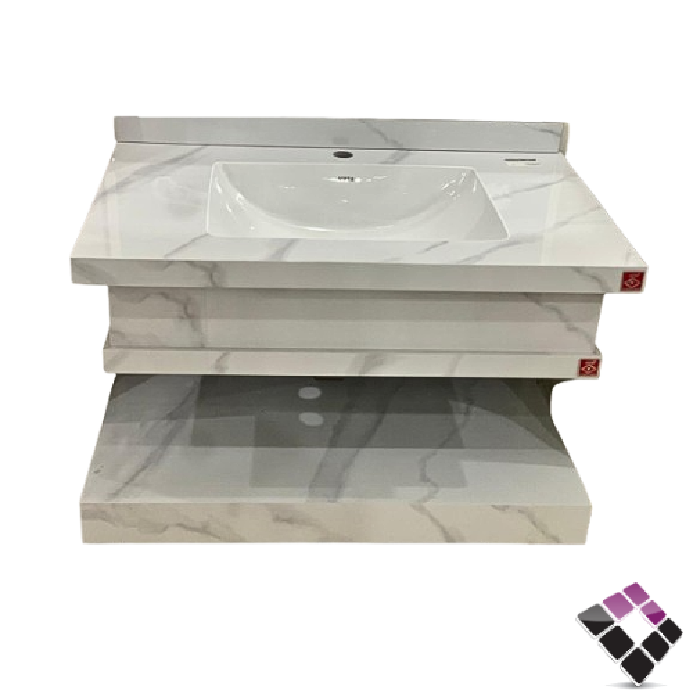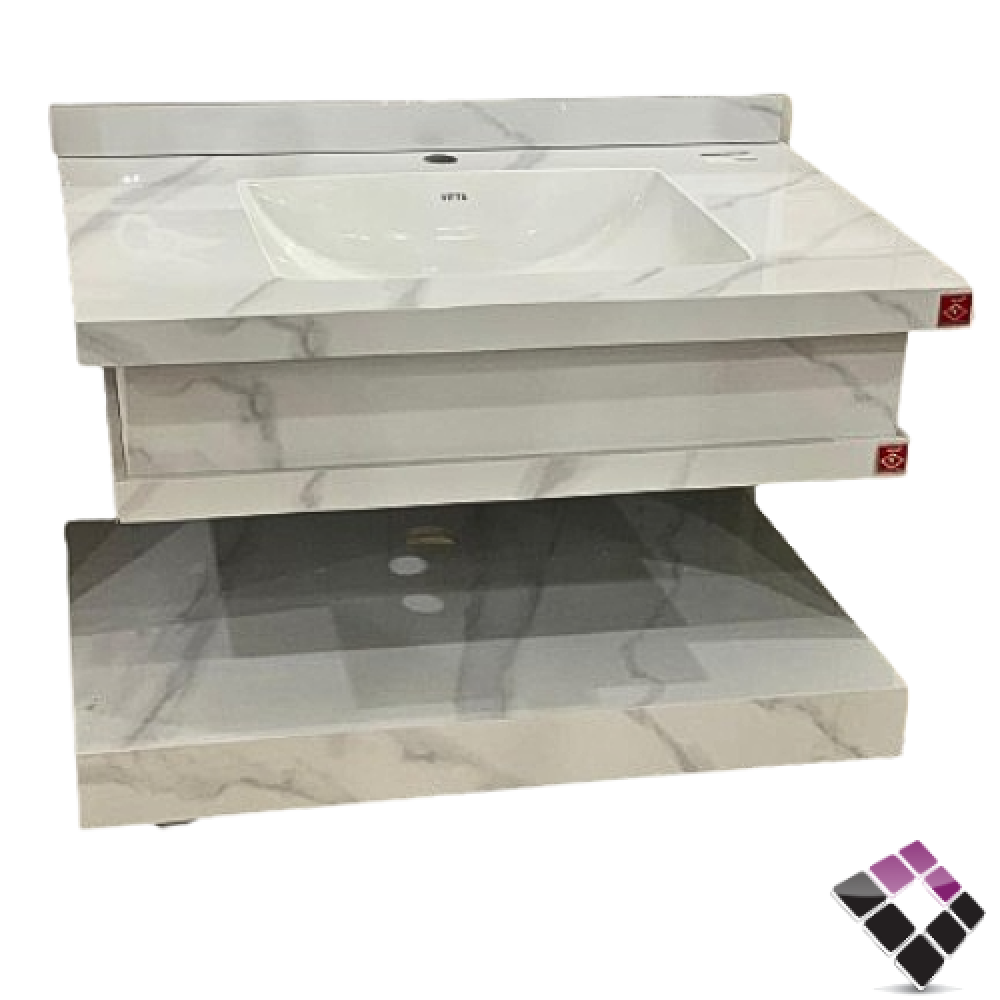 مغسلة كبينة بورسلان رخامي مع إضاءة VITTA معلق لون أبيض + عرق رمادي استتواريو + رف سفلي 80CM + مراية إضاءة LED رقم/ E47