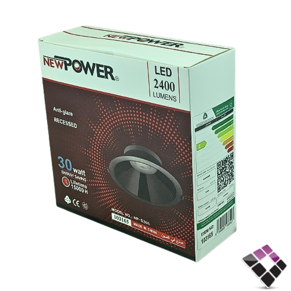كشاف داخلي LED مع مانع توهج NEW POWER إضاءة 6500K أبيض جرم خارجي أسود داخلي أسود مقاس 8"×30W رقم