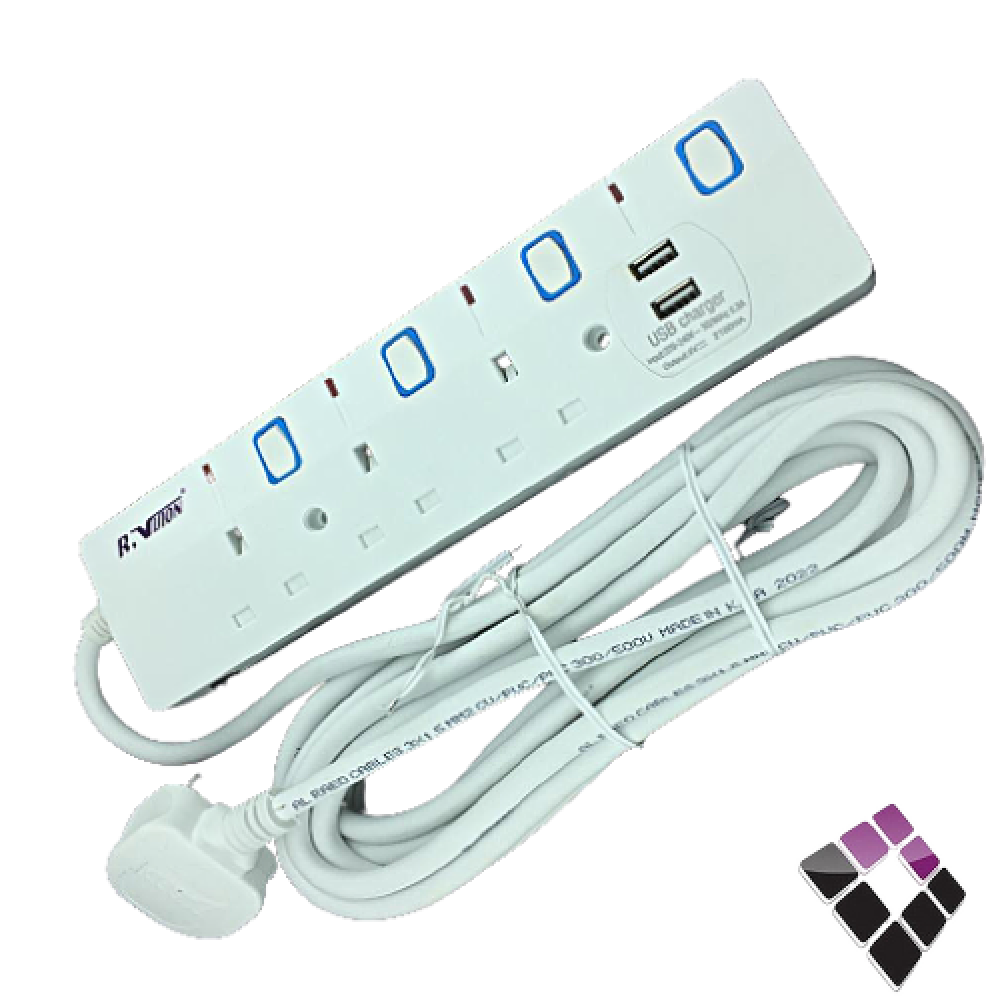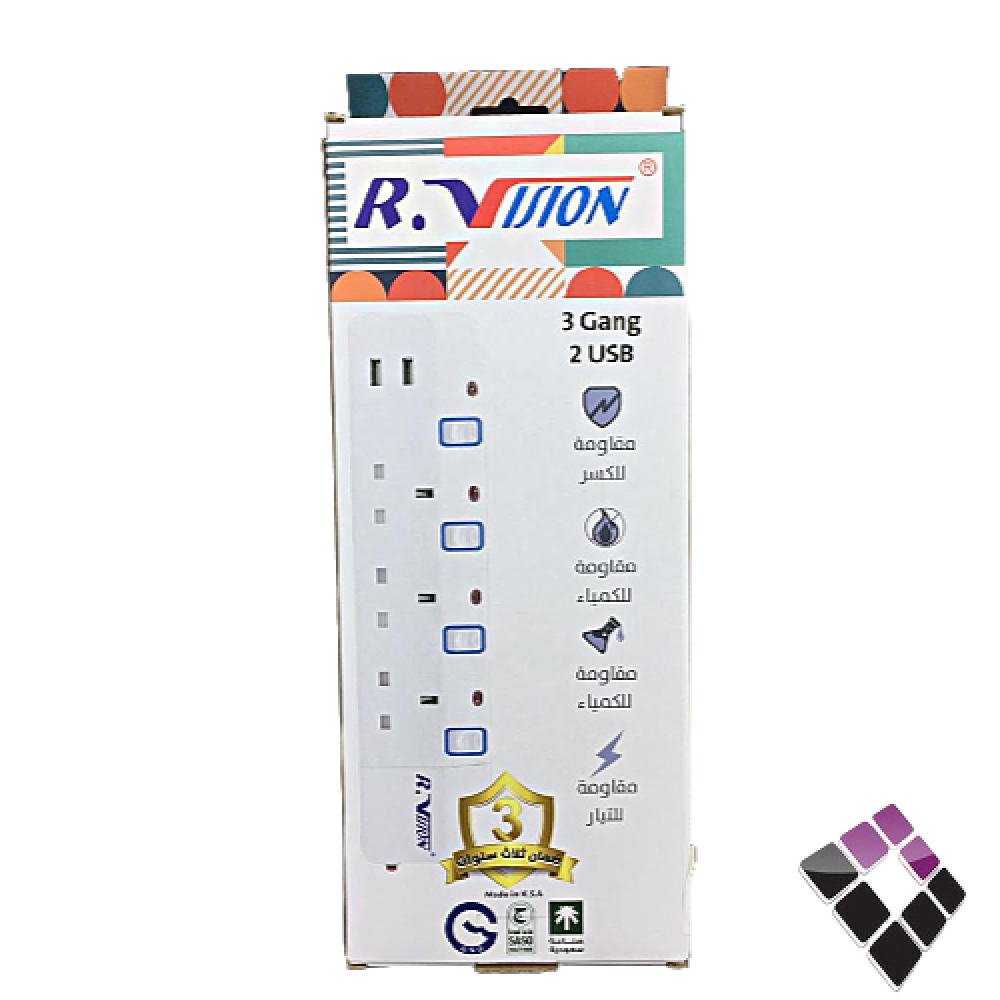 - توصيلة كهرباء R-VISION الرائد العربي سعودي سلك طول 5 متر 3 مخارج فيش 13Aمع + مفتاح و لمبة + فيوز للأمان + 2 USB...رقم الصنف (21310539)