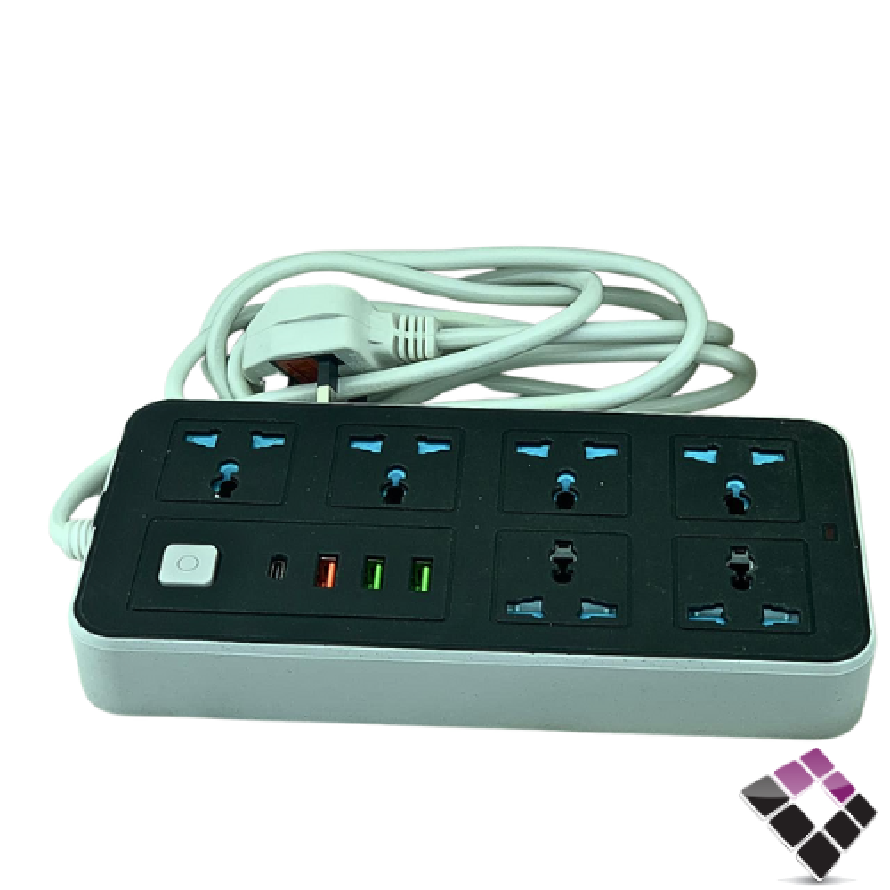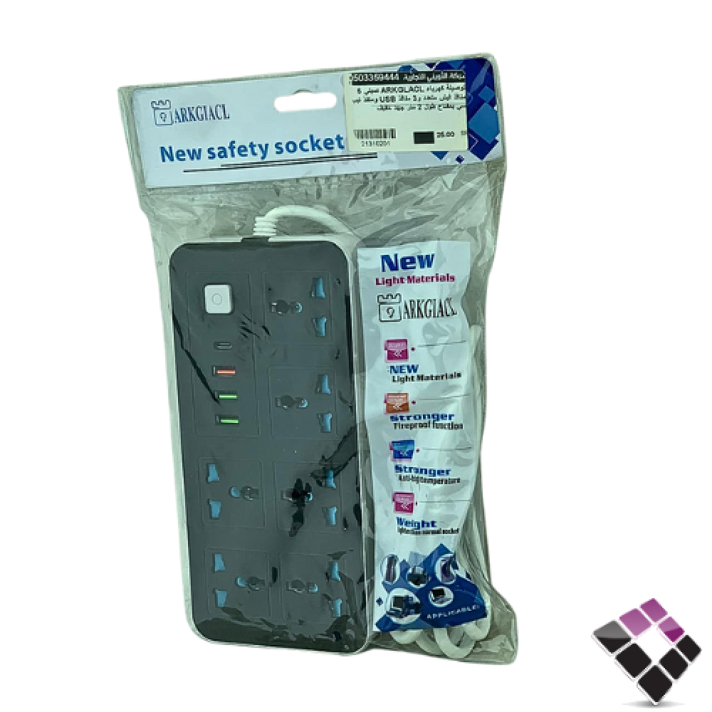 توصيلة كهرباء ARKGLACL صيني 6 منافذ فيش متعدد و3 منافذ USB ومنفذ تيب سي بمفتاح طول 2 متر جهد خفيف